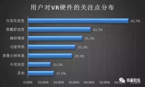 用户对于VR设备的关注度与日俱增。在VR硬件设备的关注点分布图中我们可以发现,用户最关心的还是内容。几乎绝大多数的用户都对VR内容的多样性、优质程度抱有较大关注。和一般的视频内容不同,由于VR内容的制作要求比较高的技术和成本,所以国内的VR内容并不是十分成熟,当前已经有越来越多的创业团队倾注在此,相信优质的爆款内容出现后,将会大大提升用户对于虚拟现实的认知。