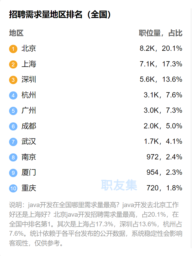 从人才需求量对比上,从职友集最新的统计数据也可以看出Java在招聘市场的需求之大。