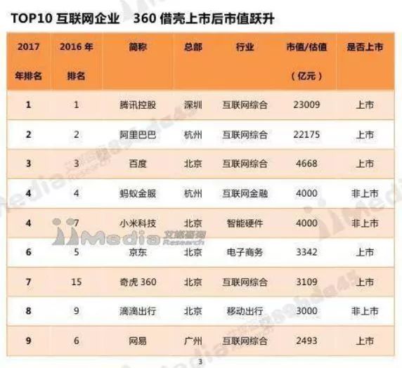 其中,腾讯控股、阿里巴巴、百度、蚂蚁金服连续两年位居前四,小米科技超越京东,与蚂蚁金服并排第四名。
