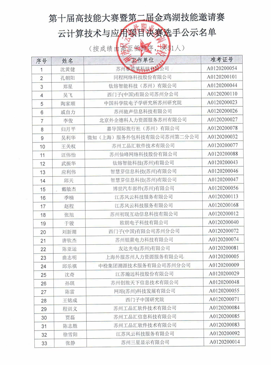 根据第十届高技能大赛暨第二届金鸡湖技能邀请赛各项目竞赛规程规定,8月22日云计算技术及应用项目如期进行了预赛,目前已完成阅卷、核分及成绩统计等工作。经大赛组委会审定,云计算技术及应用项目决赛选手建议名单,具体见附件1。公示期:8月27日—8月29日(截止时间为29日下午14:00)。如查询预赛具体得分,可联系各项目负责人。